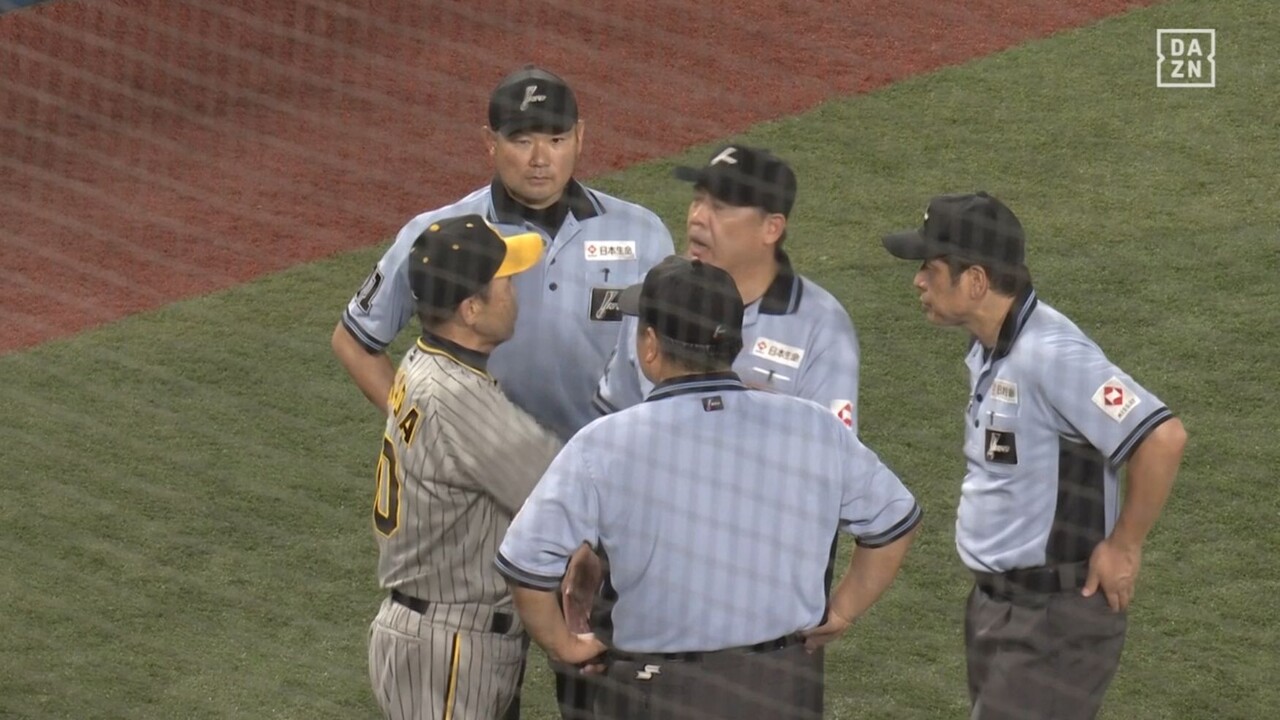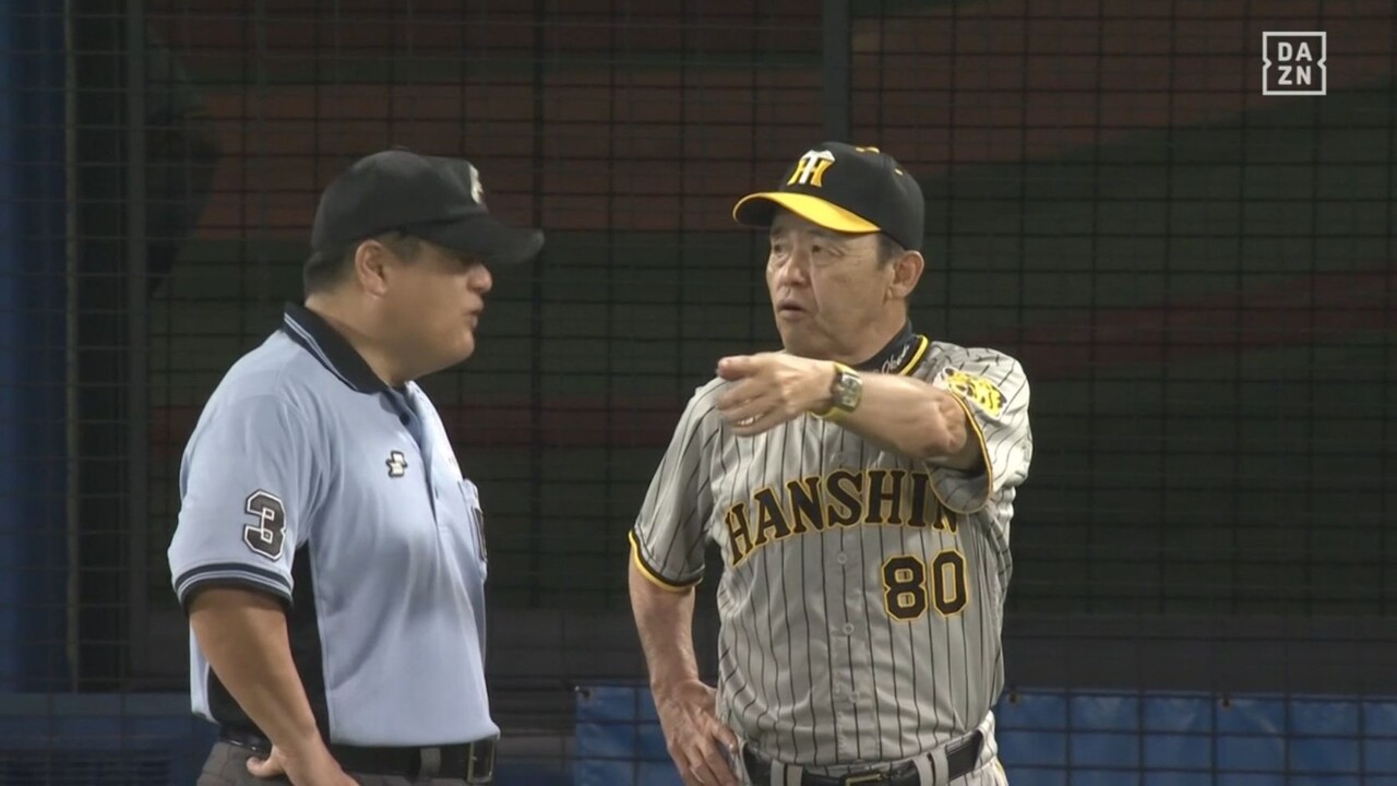 審判は妨害ではないと判断し、アウトをコール。岡田監督はすぐにベンチを出て抗議を開始した。口調がどんどん激しくなり、平田ヘッドコーチもベンチを出て、間に入って止めた。