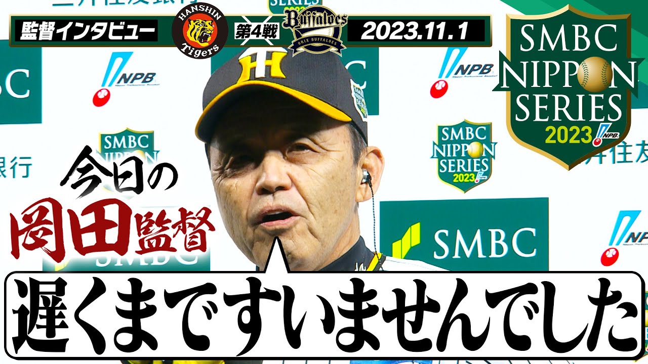 日本シリーズで岡田監督は甲子園初勝利となり「すごい声援をもらって、選手も奮い立ってるんで。明日で甲子園は終わりになるんですけど、明日は全員で絶対に勝ちたい」と力を込めた。