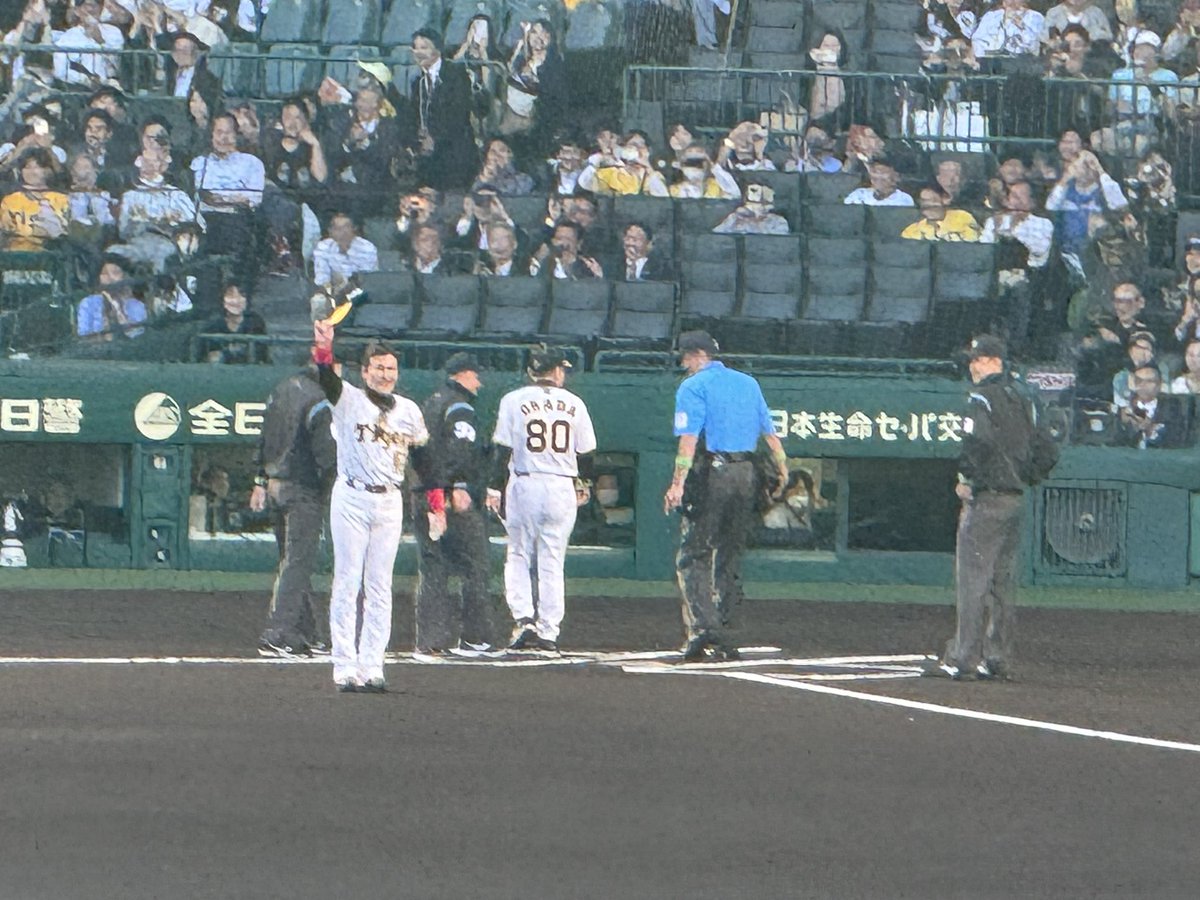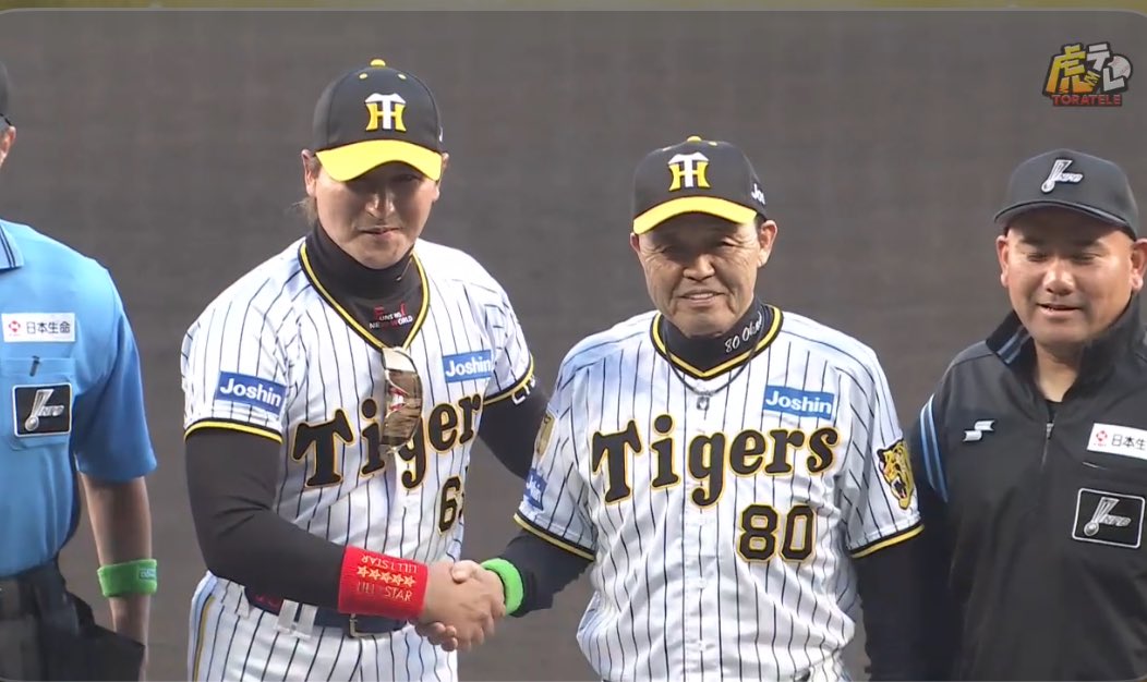 岡田監督とはハイタッチこそしなかったものの、ガッチリ握手。そのまま審判弾とともにバックネット側を向いて並び、スコアボードをバックに写真撮影した。