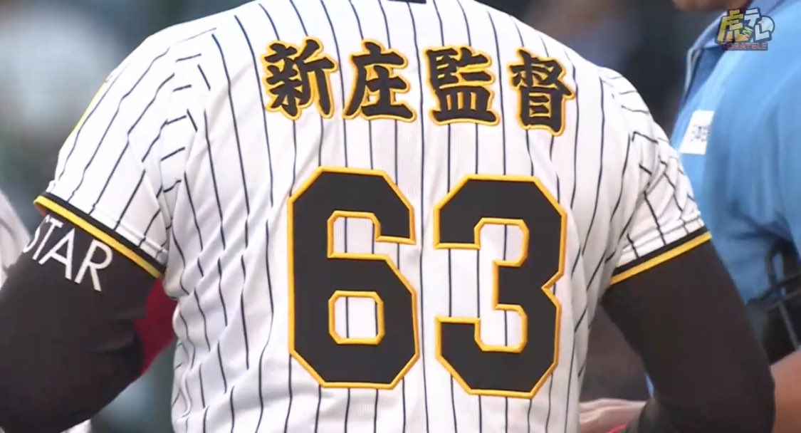 三塁側ベンチから登場した新庄監督は何と縦じまの阪神のユニホーム姿で登場。背番号は入団当初の63番。トレードマークの赤いリストバンドをつけた現役当時の姿を再現した。