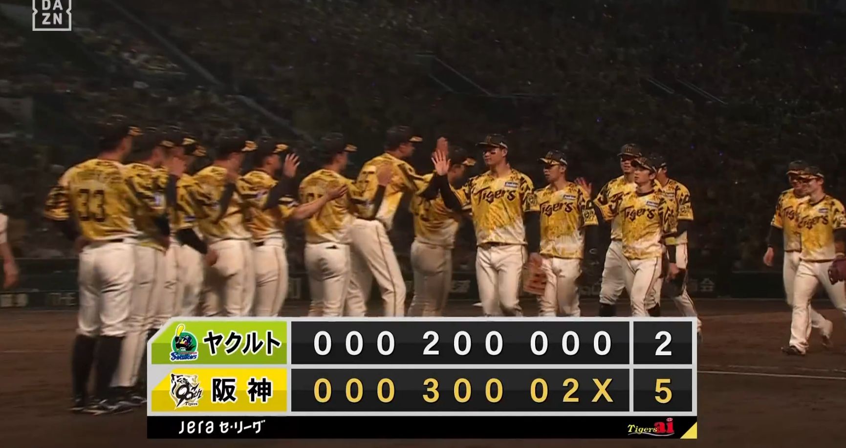 阪神はヤクルトに逆転勝ち、両リーグ最速50勝に到達し今季最多タイ貯金18に戻した。先発・デュプランティエは4回、太田に適時打を浴び2点を先制される。だが直後の4回、石川に中野の安打、森下の四球、佐藤輝の安打で無死満塁とし大山が右前に2点適時打、小幡も右前に適時打を放ち逆転。小幡は8回にも適時二塁打をマークした。デュプランティエは7回5安打10奪三振の2失点で6勝目、通算105奪三振はリーグトップ。8回は石井、9回は岩崎が締めて4年連続の20セーブ目。