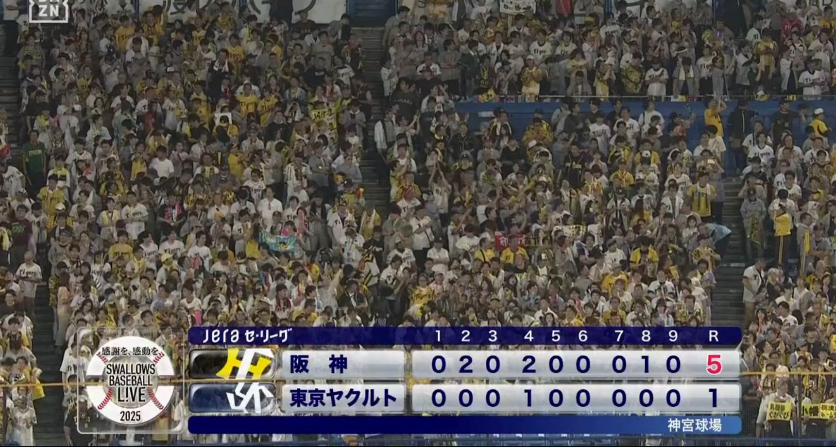 首位の阪神がヤクルトに連勝し、貯金を今季最多の23とした。前夜、再点灯させた優勝に向けたマジックナンバーは、対象のDeNAが巨人に勝利したため1つ減らして35。4本塁打で効果的に得点を重ねると投げては、先発・才木が9勝目(5敗)を手にした。