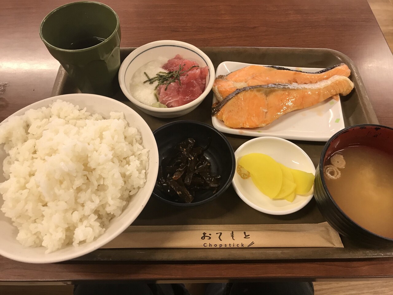 サバ塩焼きorシャケ塩焼き、まぐろ山かけ、ご飯おかわり無料、味噌汁、たくあん