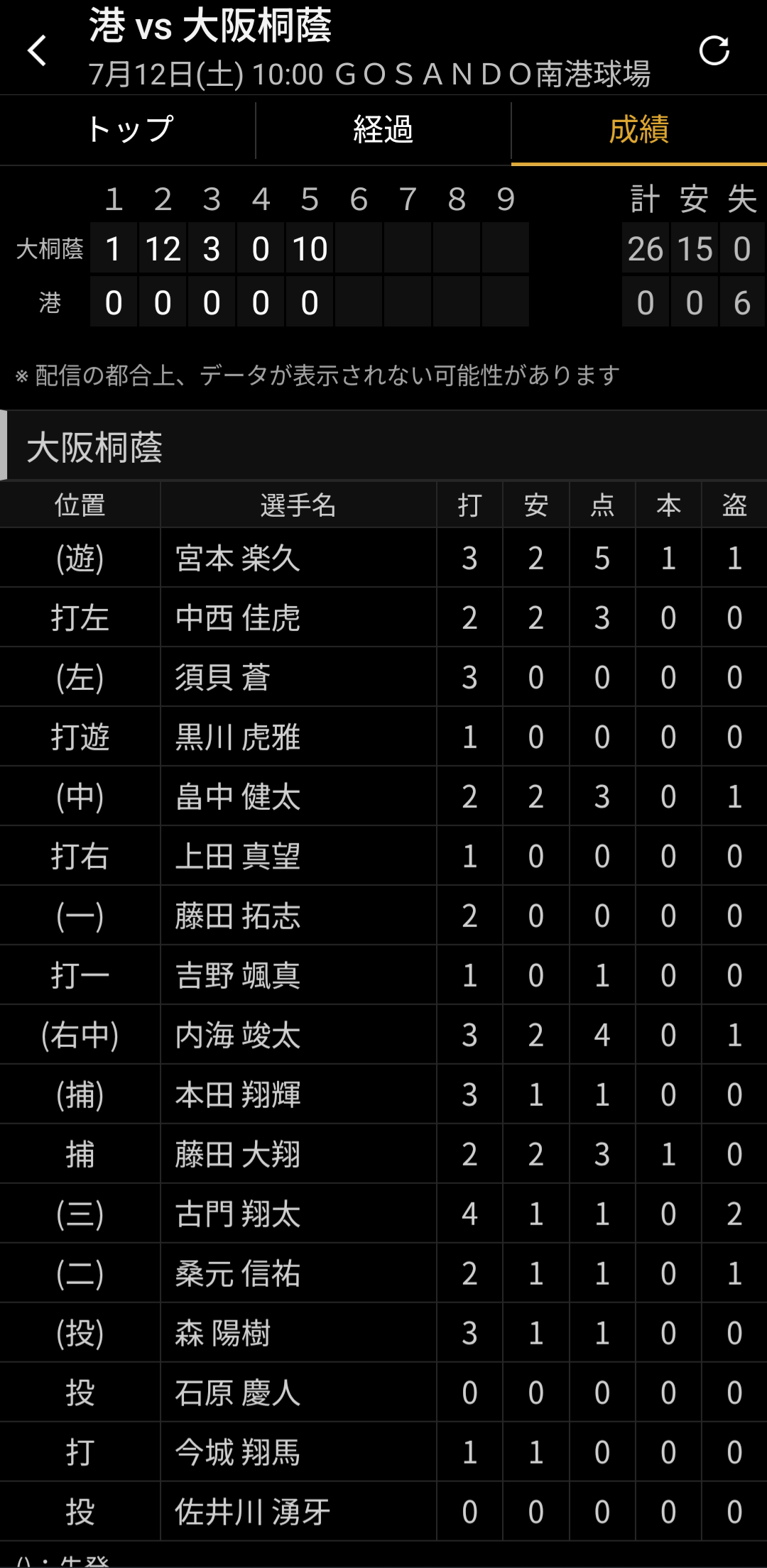 大阪桐蔭が初戦に臨み、5回コールドの26対0で港に圧勝した。1回に1点を先制すると、2回には一気に12得点。5回も10得点を挙げるなど、2本のアーチも飛び出し、攻撃の手を緩めなかった。