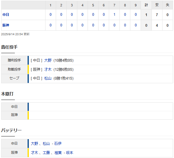 【試合結果】 9/14 中日 1-0 阪神 大野連敗を止める8回無失点で10勝目!松山41セーブ!