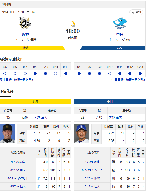 【ドラゴンズ実況】 9/14 中日 vs 阪神(甲子園)18:00~ 先発:大野雄大【中継:三重TV スカイA DAZN他】