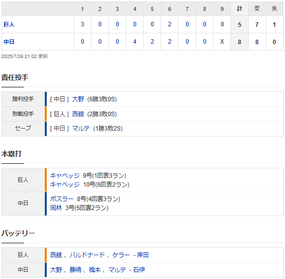 【試合結果】 7/29 中日 8-5 巨人 逆転勝ちで連敗ストップ!ボスラー岡林に一発!大野6勝目 引用元:https://baseball.yahoo.co.jp/npb/game/2021029599/top 続きを読む