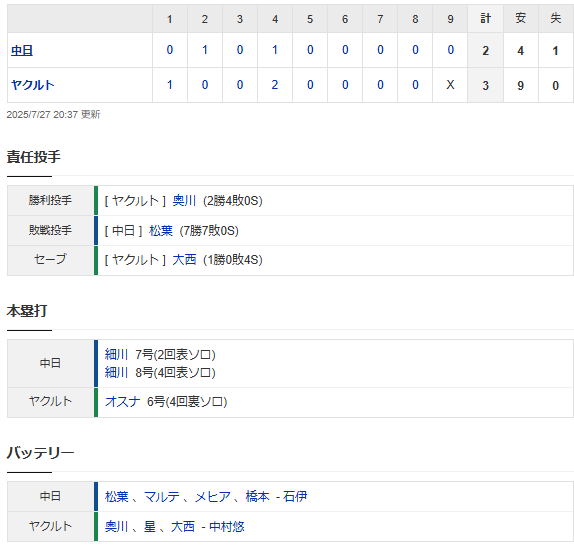 【試合結果】 7/27 中日 2-3 ヤクルト 4連敗・・松葉今季最短5回途中で3失点降板 打線細川2発も僅か4安打 引用元:https://baseball.yahoo.co.jp/npb/game/2021029592/top 続きを読む