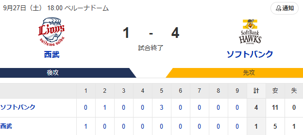 ライオンズ対ホークス 14:00~(ベルーナドーム)