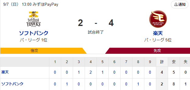 【2-4】ホークス連勝は5でストップ 9月初の黒星 マジックは一つ減って15