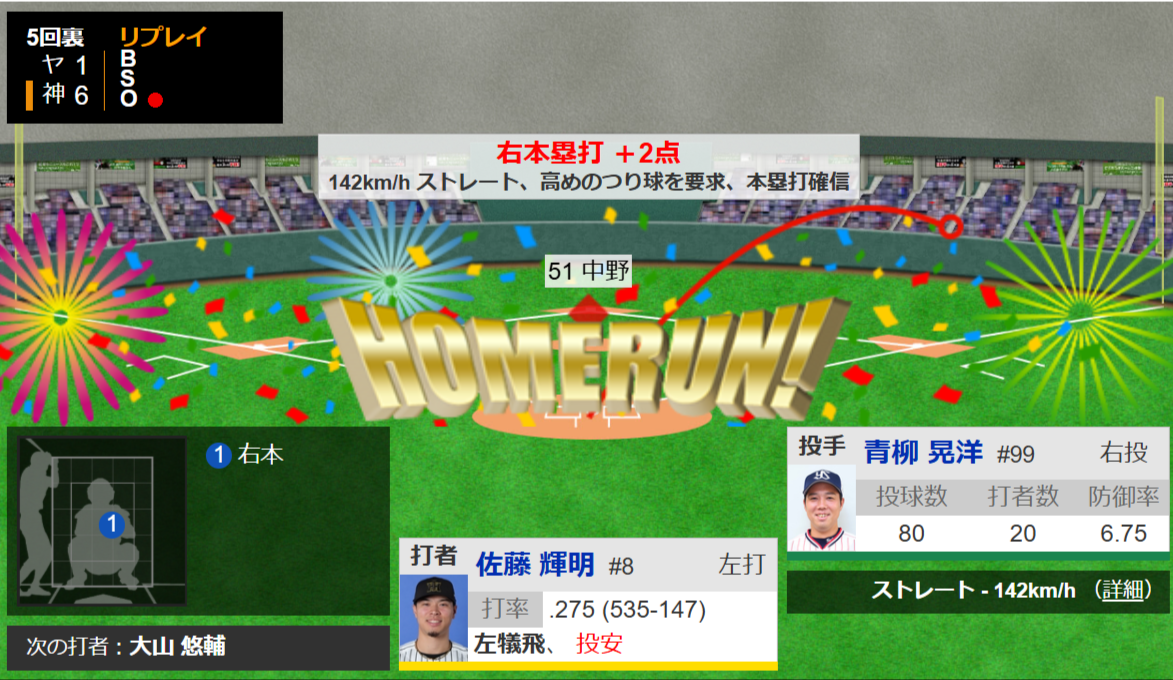 初回には、2アウト3塁の好機から打席に佐藤輝明選手が向かいます。ここまで99打点をあげていた佐藤選手は2球目のストレートをとらえ、レフトへの大きな打球を放ちます。惜しくも柵越えとはなりませんでしたが、犠牲フライには十分。これで3塁ランナーの近本光司選手が生還し、佐藤選手も100打点目を記録しました。