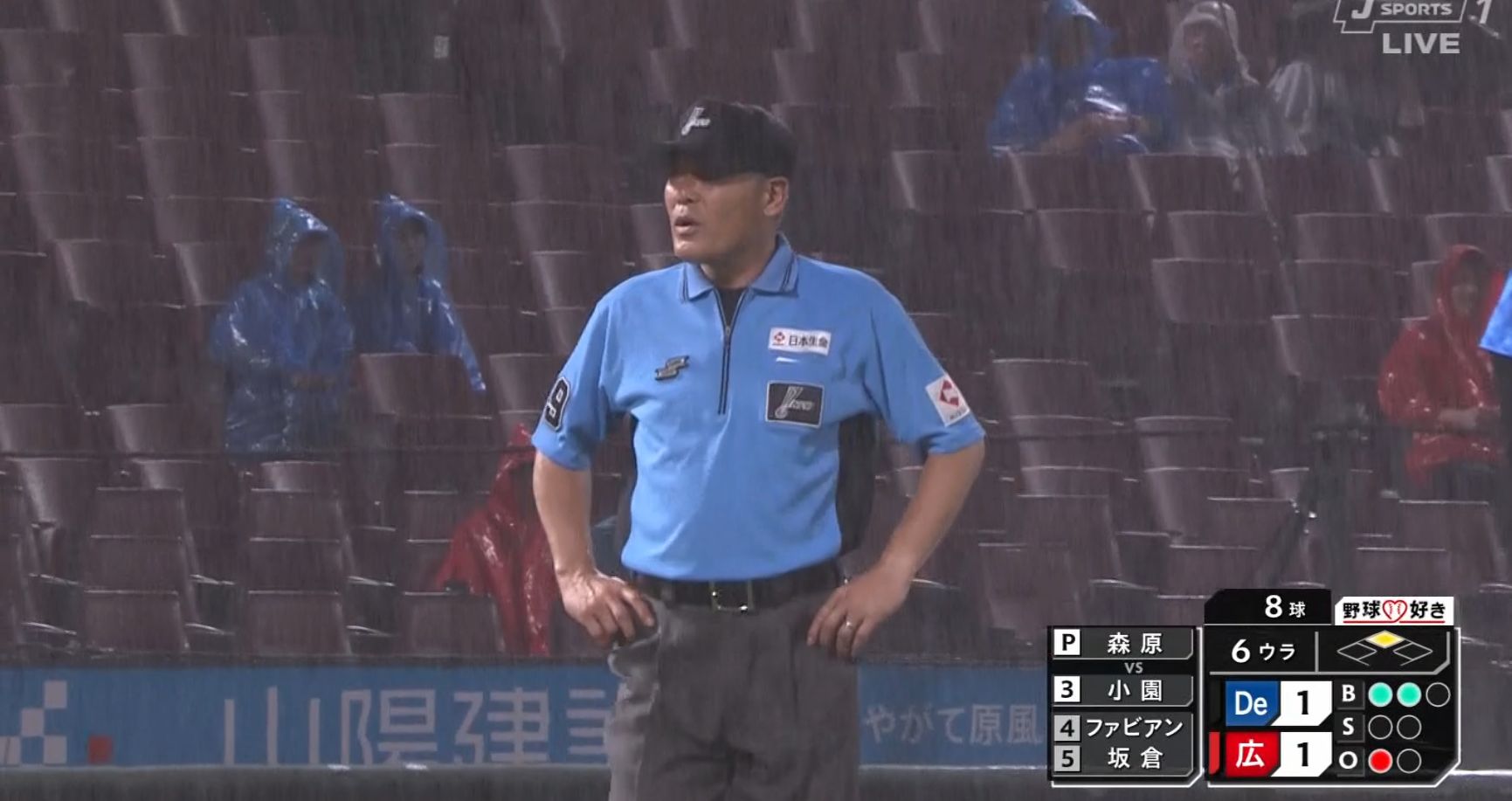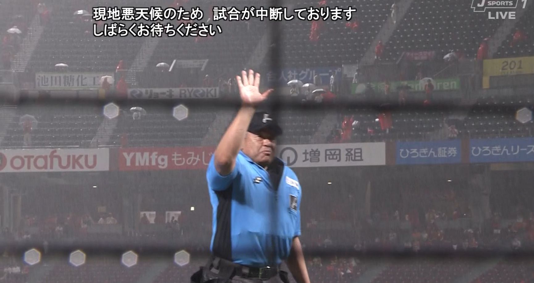 この日は試合前から雨が降りしきり、0―0の2回表1死一塁で雨脚が一気に強まり、1度目の降雨中断。ここは1時間18分を経て再開し、1―1のまま5回を終えて試合は成立した。