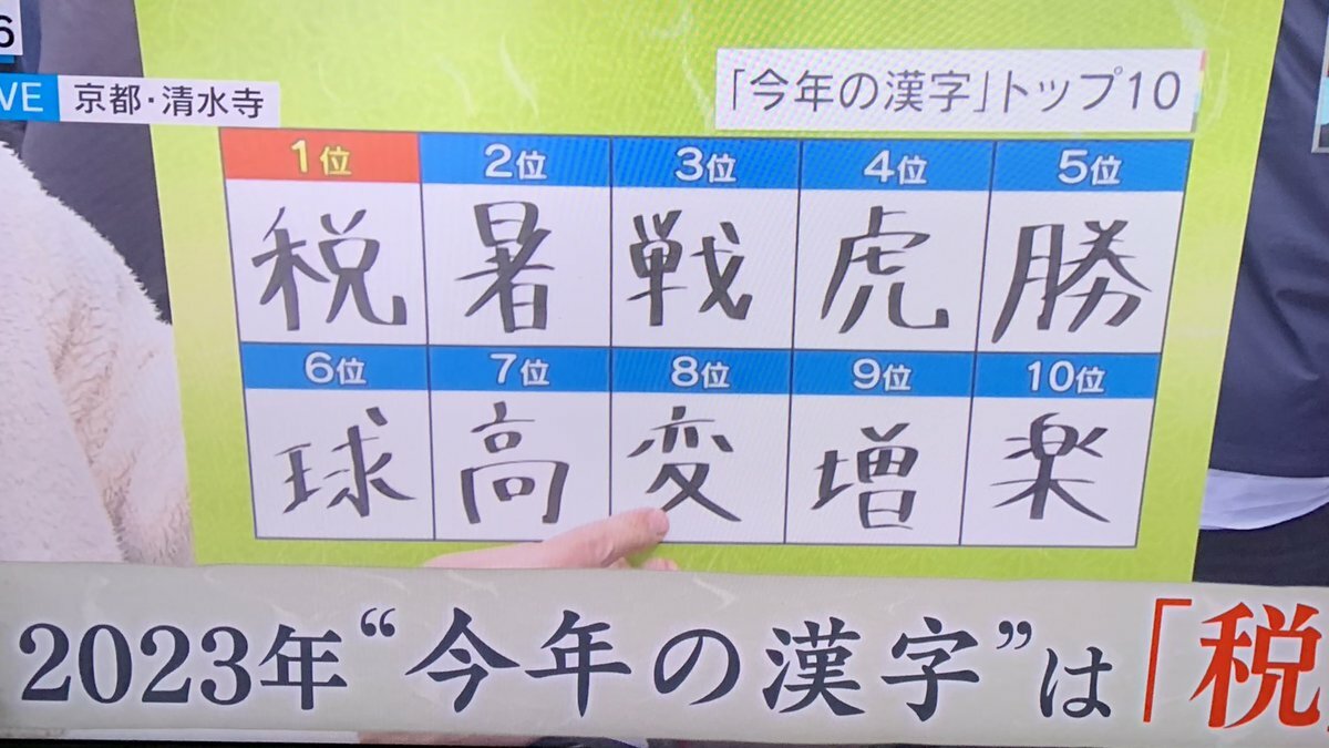 【速報】今年の漢字は「税」 阪神タイガース優勝からか「虎」は4位