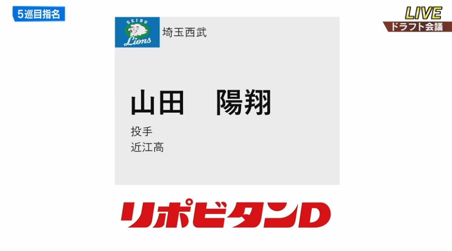 プロ野球のドラフト会議が20日、都内のホテルで行われ、西武が近江(滋賀)・山田陽翔投手(18)を5位で指名した。