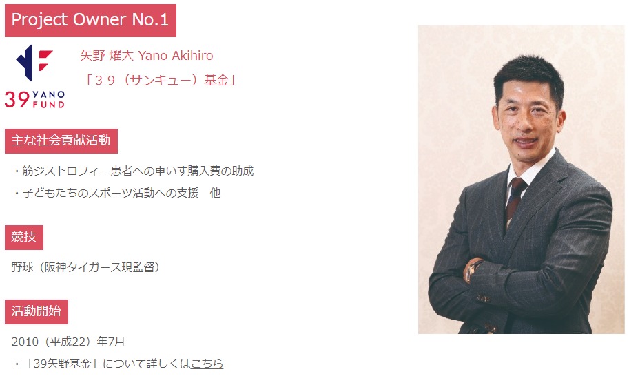 同ファンドは、矢野前監督が現役時代の10年から続けてきた社会貢献基金「39矢野基金」をNPO法人として独立。他のアスリートも社会貢献に参画できるよう、そのサポートをすることを主な活動としている。